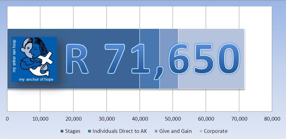 We have just received another R10 000 corporate donation which brings our fund raising total to: