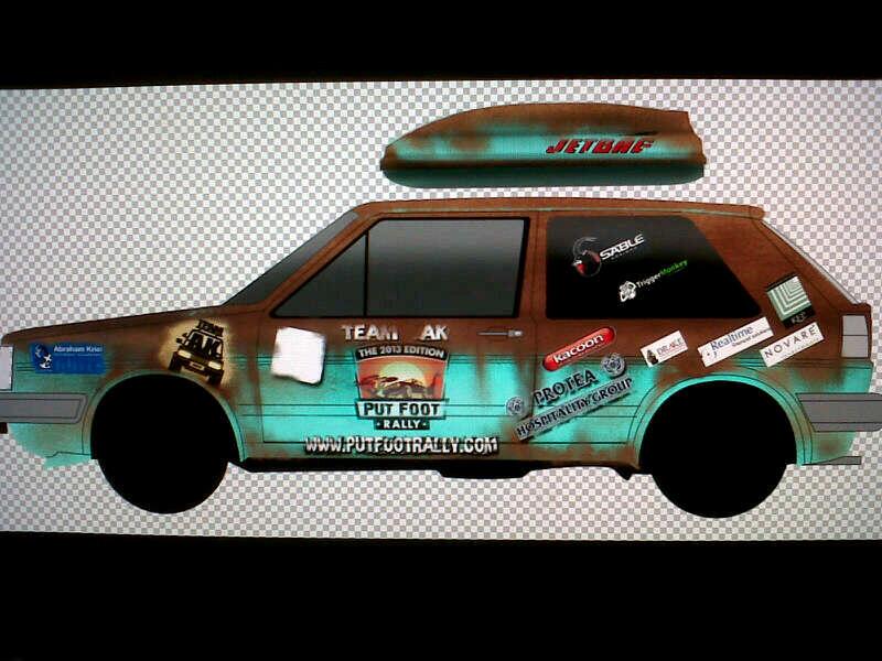 Check out the initial design idea from Kacoon Vehicle Branding for our Put Foot Rally car! It’s going to look all rusted and klapped out like it won’t make the trip…but Kevin likes to be underestimated…likes to be the underdog…he thrives on flying in under the radar!
